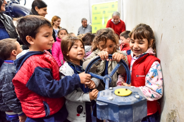 De manera simbólica, los pequeños acompañados por docentes, directivos de la institución, padres, trabajadores municipales y miembros del equipo de gobierno, abrieron las tres llaves exclusas a través de las cuales se ponen en funcionamiento los nuevos pozos de extracción ubicados en la ruta, las tres etapas de la red de macromalla y la cisterna, que garantizan una correcta y mejor distribución del servicio de agua potable para los distintos sectores de la ciudad.