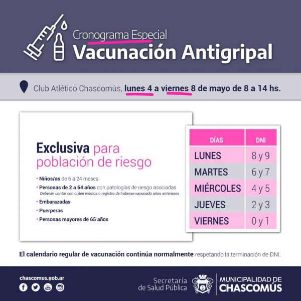 Cabe desatcar que se aplicará un stock diario de vacunas y se aplicarán, desde el lunes 4 al viernes 8 de mayo de 8 a 14hs en el Club Atlético Chascomús, respetando las terminaciones de DNI: