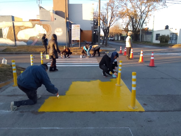 Se realizaron tareas de pintura de cordones en color amarillo y del pavimento con color blanco para demarcar el área segura para el cruce de los peatones, que debe ser respetada por los automovilistas.